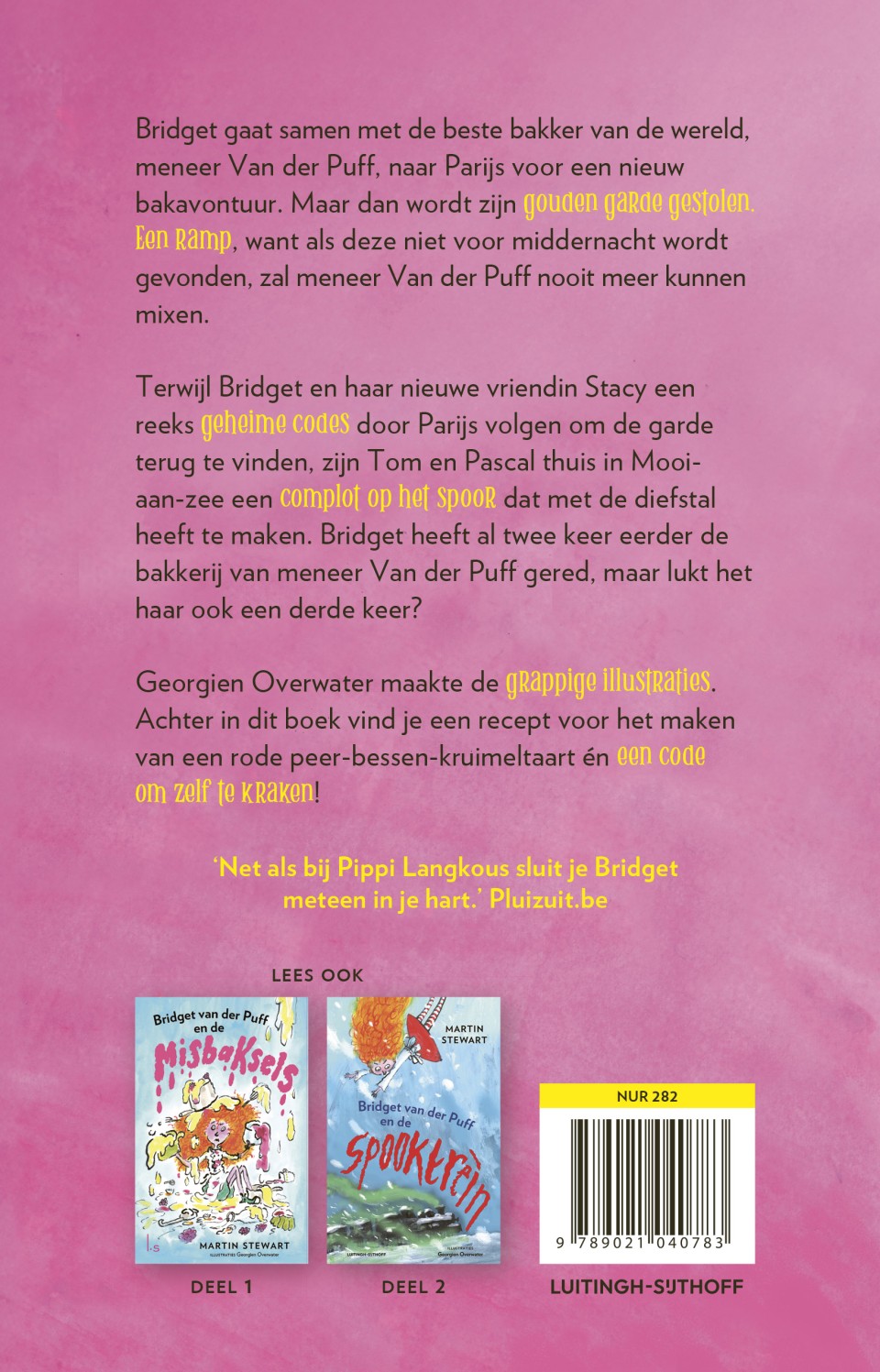 Bridget van der Puff bakt er vrolijk op los in dit derde, los te lezen boek van Martin Stewart en illustrator Georgien Overwater. Na Bridget van der Puff en de misbaksels (Thematitel Kinderboekenweek 2024) en Bridget van der Puff en de spooktrein is er nu Bridget van der Puff en de gestolen gouden garde. Met uiteraard een bakrecept achterin! Bridget zet samen met meneer Van der Puff koers naar Parijs voor een nieuw bakavontuur. Maar iemand steelt zijn gouden garde. Een ramp, want als deze niet voor middernacht is gevonden, zal de beste bakker ter wereld nooit meer kunnen mixen. Terwijl Bridget en haar nieuwe vriendin Stacy een reeks onmogelijke puzzels door Parijs volgen, zijn Tom en Pascal in Mooi-aan-zee een groot bedrog op het spoor dat met de diefstal te maken heeft… ‘De combinatie van de illustraties, schrijfstijl en de talrijk bedachte uitvindingen geven deze reeks een geweldige Roald Dahl-vibe.’ Ouderblog.be