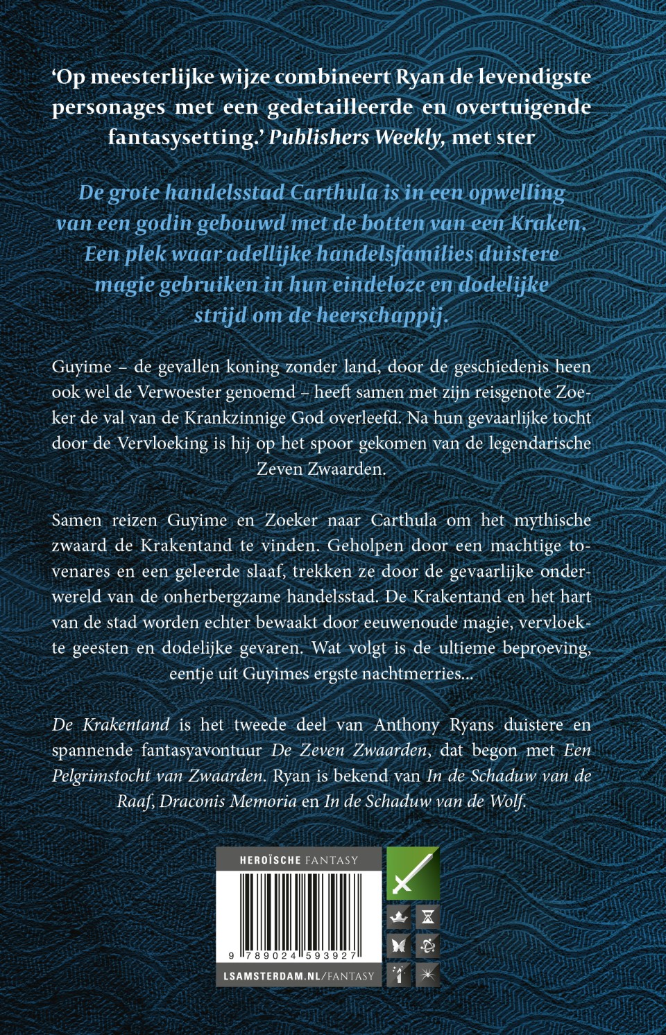 In De Krakentand, het tweede deel in De Zeven Zwaarden-serie van Anthony Ryan, vervolgt Guyime zijn zoektocht naar de Zeven Zwaarden. Zijn volgende doel: het mythische zwaard ‘de Krakentand’. Geleid door de magie reist Guyime naar Cathula, in het midden van de Eerste Zee, om dit zwaard op te sporen. Geholpen door drie compagnons – de beestenbezweerder Zoeker, een machtige tovenares, en een geleerde slaaf – bereikt Guyime een van de gevaarlijkste uithoeken van de wereld om zijn missie te voltooien. Zijn schat is echter moeilijk te bereiken – eeuwenoude magie, vervloekte geesten en dodelijke vallen staan hem in de weg. Samen met zijn metgezellen zal hij een ultieme beproeving moeten doorstaan, eentje uit zijn ergste nachtmerries… ‘Op meesterlijke wijze combineert Ryan de meest levendige personages met een gedetailleerde en overtuigende fantasy-setting.’ Publishers Weekly, starred review
