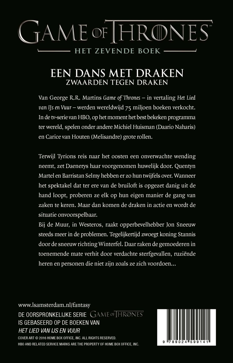 Een Dans met Draken – Zwaarden tegen Draken is het zevende deel in bestsellerauteur George R.R. Martins Game of Thrones-serie (Het Lied van IJs en Vuur). Er zijn wereldwijd meer dan 75 miljoen boeken van de reeks verkocht. In de tv-serie van HBO spelen onder andere Michiel Huisman (Daario Naharis) en Carice van Houten (Melisandre) een grote rol.