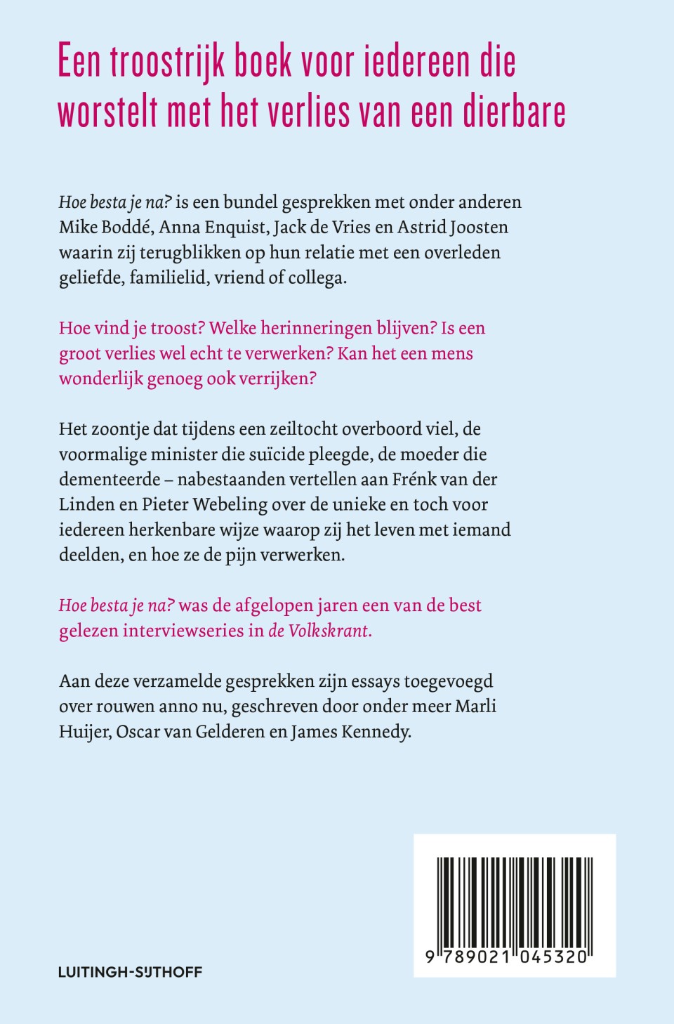 Hoe besta je na? van Frénk van der Linden en Pieter Webeling was de afgelopen jaren één van de best gelezen interviewseries in de Volkskrant, over omgaan met het verlies van een dierbare. Deze indringende portretten zijn nu gebundeld samen met nieuwe essays over rouwen.