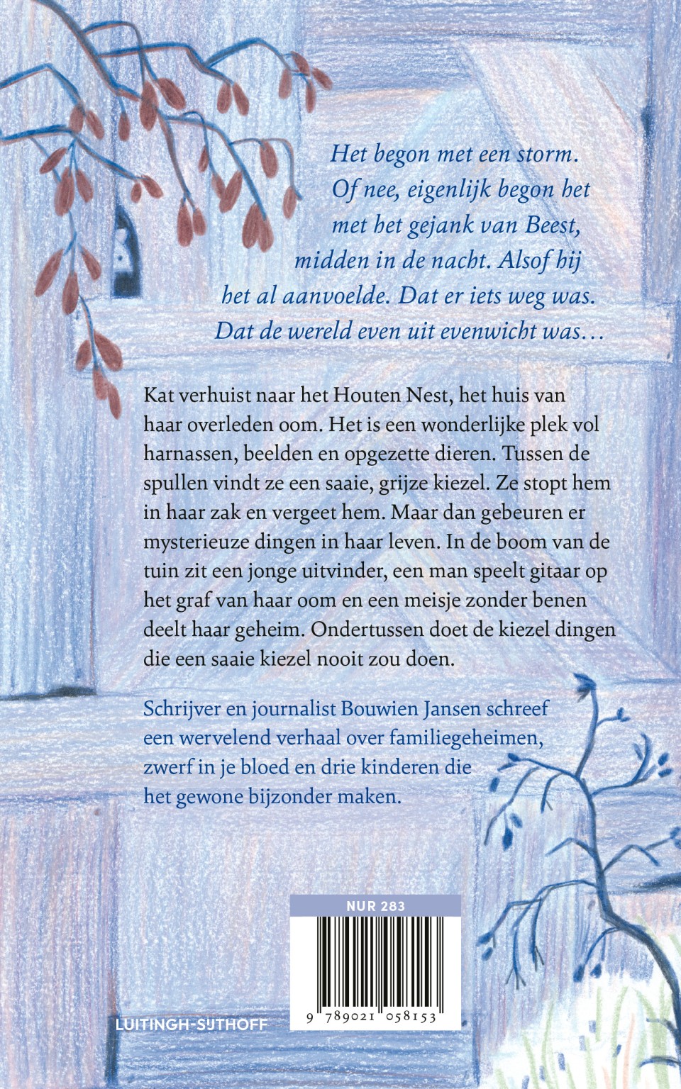 Kat verhuist naar het huis van haar overleden oom, aan de rand van de stad. Het Houten Nest is een wonderbaarlijke plek. Tussen de rammelende harnassen, geheimzinnige beelden en opgezette dieren vindt Kat een kiezel. Saai en supergrijs. Ze laat hem in haar zak glijden en vergeet hem. Maar dan gebeuren er vreemde dingen in haar leven. In de boom van haar tuin zit een uitvinder, een man speelt gitaar op het graf van haar oom en een meisje zonder benen deelt haar geheim. Ondertussen doet de kiezel dingen die een saaie kiezel nooit zou doen…