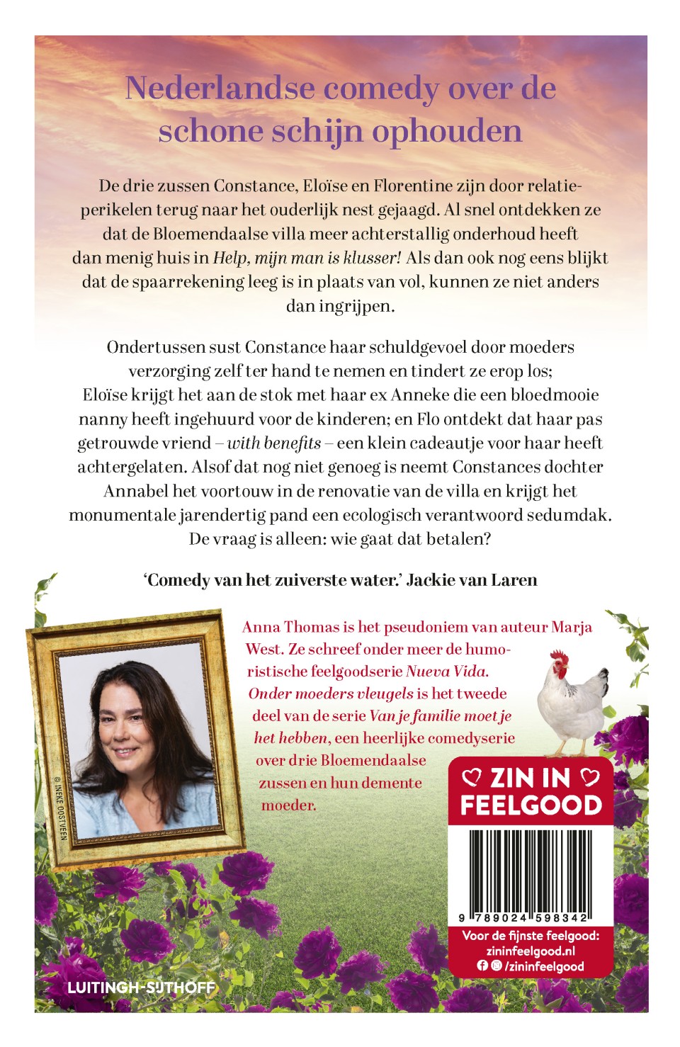 In Onder moeders vleugels van Anna Thomas hebben relatieperikelen de drie zussen terug naar het ouderlijk nest gejaagd. Al snel ontdekken ze dat de Bloemendaalse villa meer achterstallig onderhoud heeft dan menig huis in Help, mijn man is klusser. Als dan ook nog eens blijkt dat de spaarrekening leeg is in plaats van vol en de thuishulp van moeder meedeelt in de erfenis, kunnen ze niet anders dan ingrijpen. De vraag is alleen: hoe komen ze aan het benodigde geld?