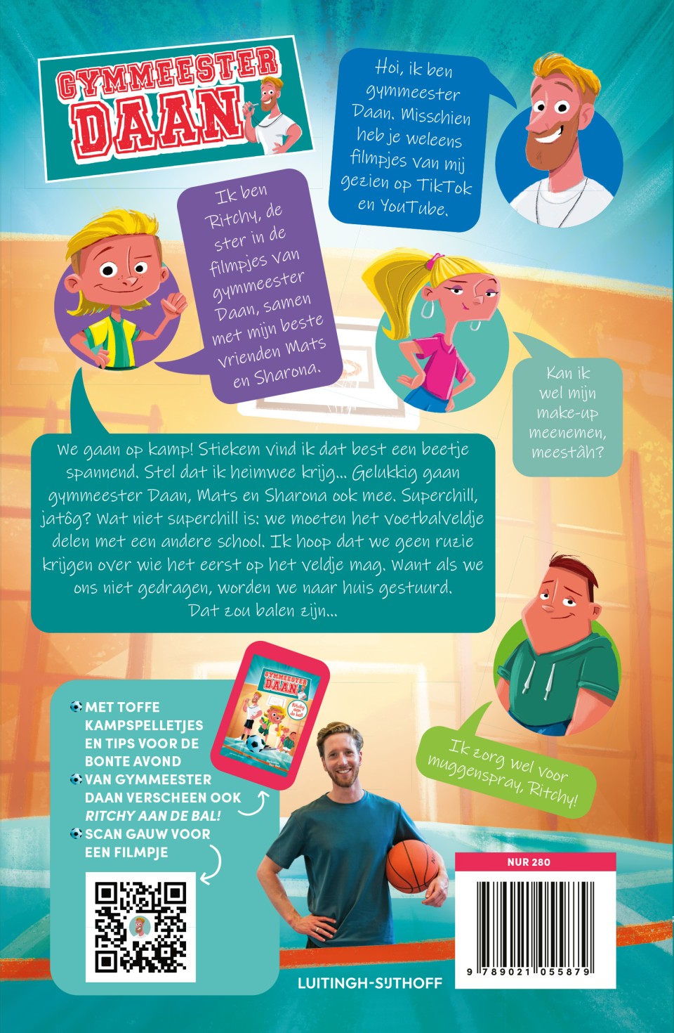 Na Ritchy aan de bal! is er nu een tweede, los te lezen jeugdboek van Gymmeester Daan. Ritchy en zijn vrienden Mats en Sharona gaan op schoolkamp en komen voor nieuwe uitdagingen te staan. Maar hoe los je die sportief op? Met fullcolourillustraties van Paco Vink en QR-codes naar beweegchallenges van Gymmeester Daan.