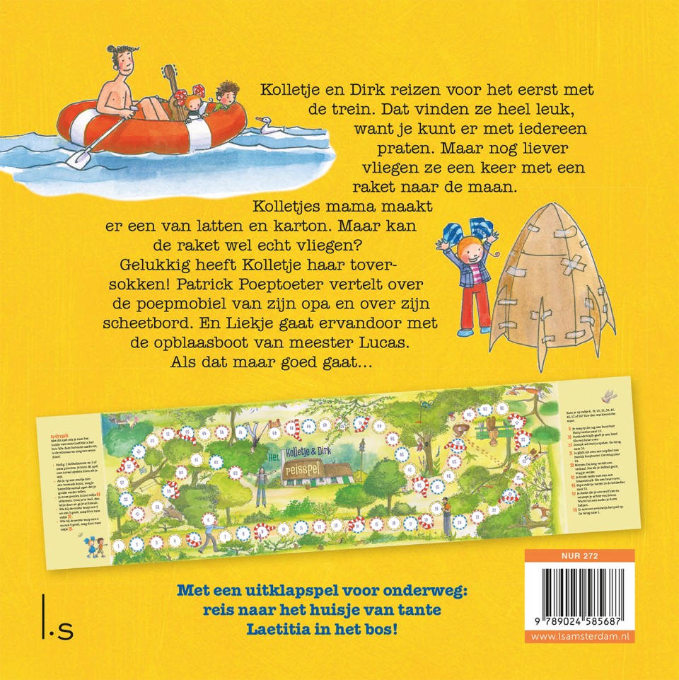 Kolletje en Dirk reizen voor het eerst met de trein. Dat vinden ze heel leuk, want je kunt er met iedereen praten. Maar nog liever vliegen ze een keer met een raket naar de maan. Dus maken Kolletjes papa en buurman Harry een raket van latten en karton. Patrick vertelt een verhaal over de poepmobiel van zijn opa. En meester Lucas heeft een opblaasbootje waarmee hij gaat varen in de vijver. Er willen zoveel mensen mee dat het bootje dreigt te zinken. Gelukkig heeft Kolletje haar toversokken!