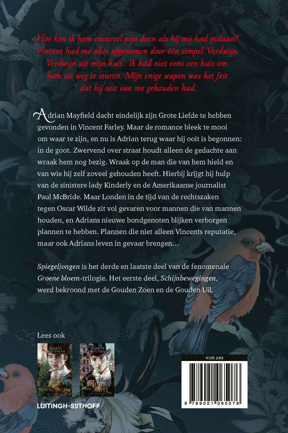 Spiegeljongen is na Schijnbewegingen en Tegenspel het derde en laatste deel van Floortje Zwigtmans indrukwekkende Groene bloem-trilogie. Deze fenomenale serie over de jonge homoseksueel Adrian Mayfield speelt zich af in victoriaans Londen. Zwigtmans Groene bloem-trilogie kan worden gerekend tot het beste wat Nederlandse young adultliteratuur te bieden heeft en is eigenlijk verplichte kost voor iedereen die zich wil verdiepen in de tijd van Oscar Wilde.