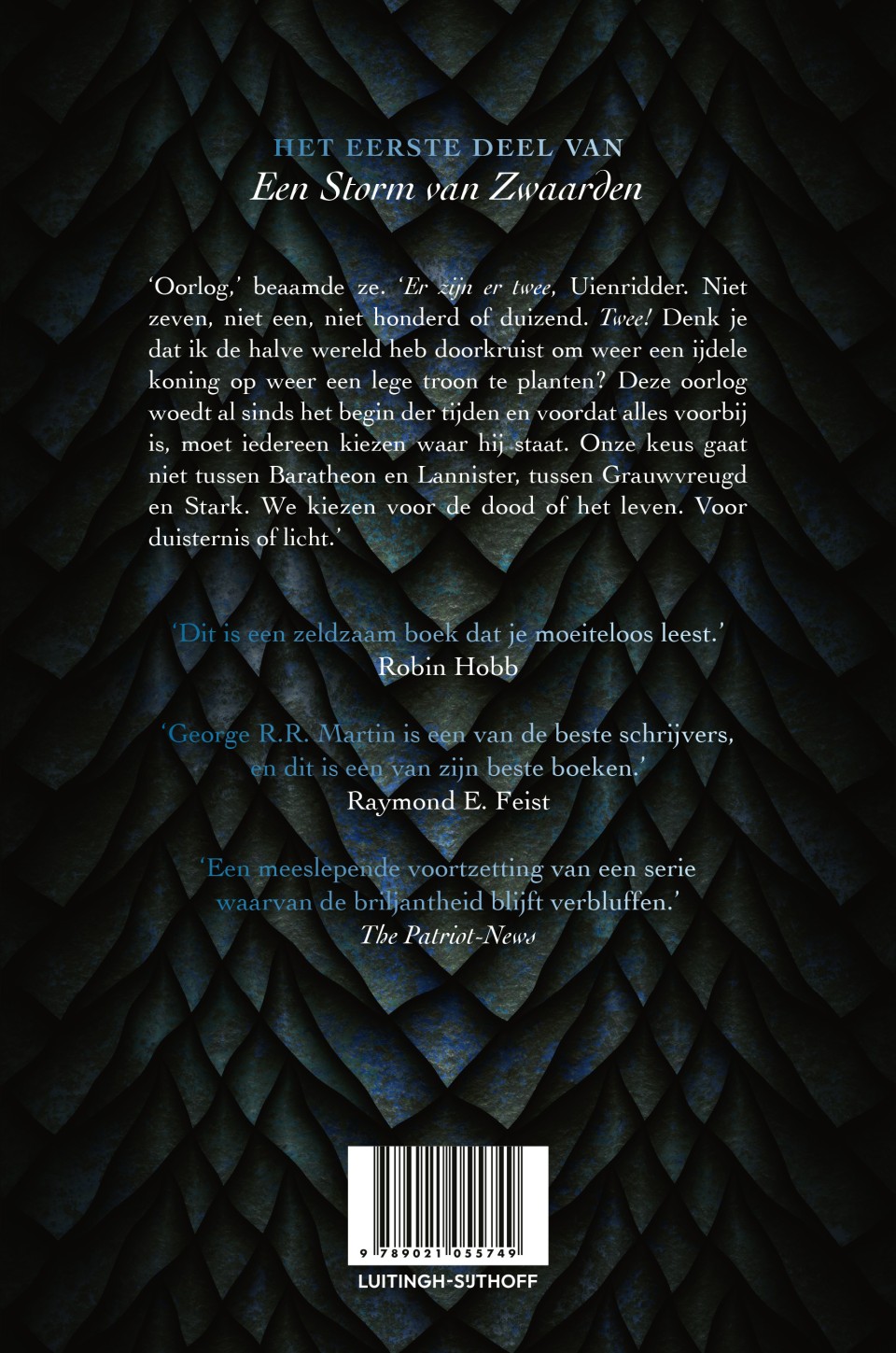 Zijn zusters zijn verdwenen, dood of overgeleverd aan de grillen van de wrede kind-koning Joffry, die met ijzeren vuist vanuit Koningslanding regeert. Joffry’s bittere rivaal, heer Stannis Baratheon, is verslagen en in schande gehuld, slachtoffer van een tovenares die hem in haar kwaadaardige greep houdt. En dat allemaal terwijl de verbannen koningin Daenerys zich een weg baant over een van bloed doordrenkt continent, met drie draken als haar metgezellen.